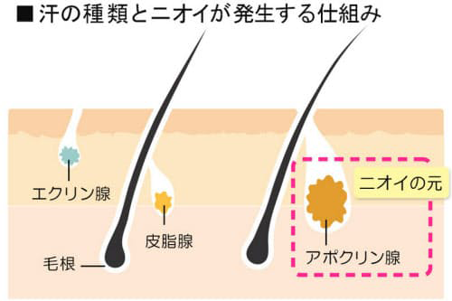さらに、本来あまりニオイのないエクリン腺からの汗とアポクリン腺から出る汗が一緒に蒸発するとその強いニオイが周囲にまで拡散されることになってしまうのです。